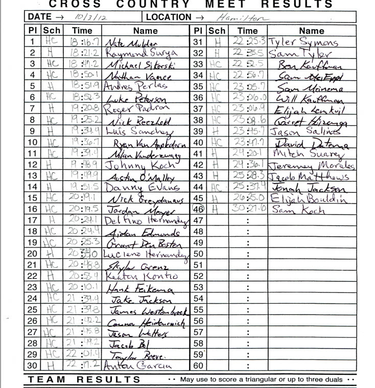 In the Boys Race Nate M. took the 1 First Spot in the race closely Followed by Michael S., Nate V., Luke. P & Nick B. Giving our Top 5 a significant lead over Holland. Congrats Boys. Keep up the Hard work.