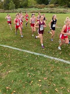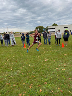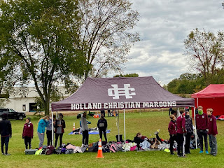 On Saturday we had the pleasure of heading out to Calvin College/Gainey Sports Complex for the Cougar Falcon Invitational. This year it was Varsity Only so we took the top 7 girls and boys to run at this event. Upon arriving we were greeted by our very own team concierge who led us to our spot along the fence and went through the rules for the day. One thing that I would like to keep for the future, team assigned porto-potty, its kind of nice to not have a Super LONG line to wait in... haha... The VIBE was very different on the course this year. Normally this course is lined with people .. so many people that you can hardly get near the finish line to see them .. this year that was not an issue. The finish was WIDE open and as coaches we could run ALL over the place and not really run into any other people.
